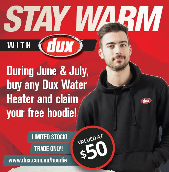 Simply purchase any Dux water heater during June or July 2024 to claim your free Dux ‘Hoodie’, valued at $50.