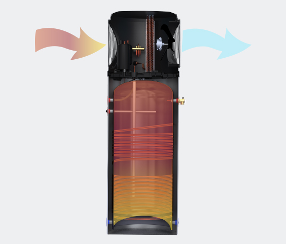Working like a fridge, but in reverse, the heat pump absorbs heat energy from the air outside the tank, and uses this free energy to help heat the water.